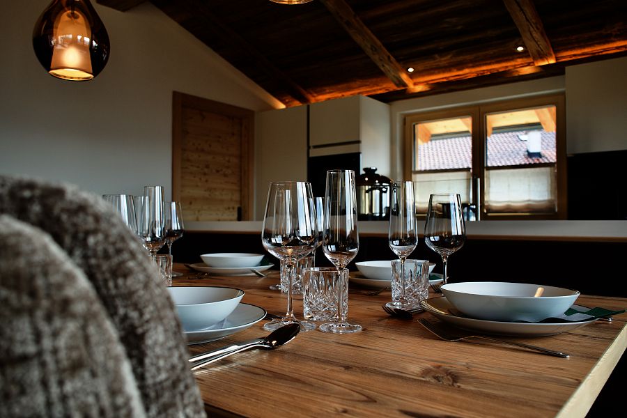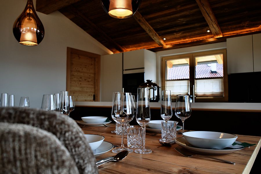 Der großzügige Eingangsbereich mit Garderobe, die voll ausgestattete Einbauküche mit Kochinsel und die Essecke für 10 Personen laden zum gemeinsamen Kochen und Verweilen ein. Das helle Wohnzimmer mit sichtbarer Feuerstelle und großer Couch sorgt für gemütliche Abende.